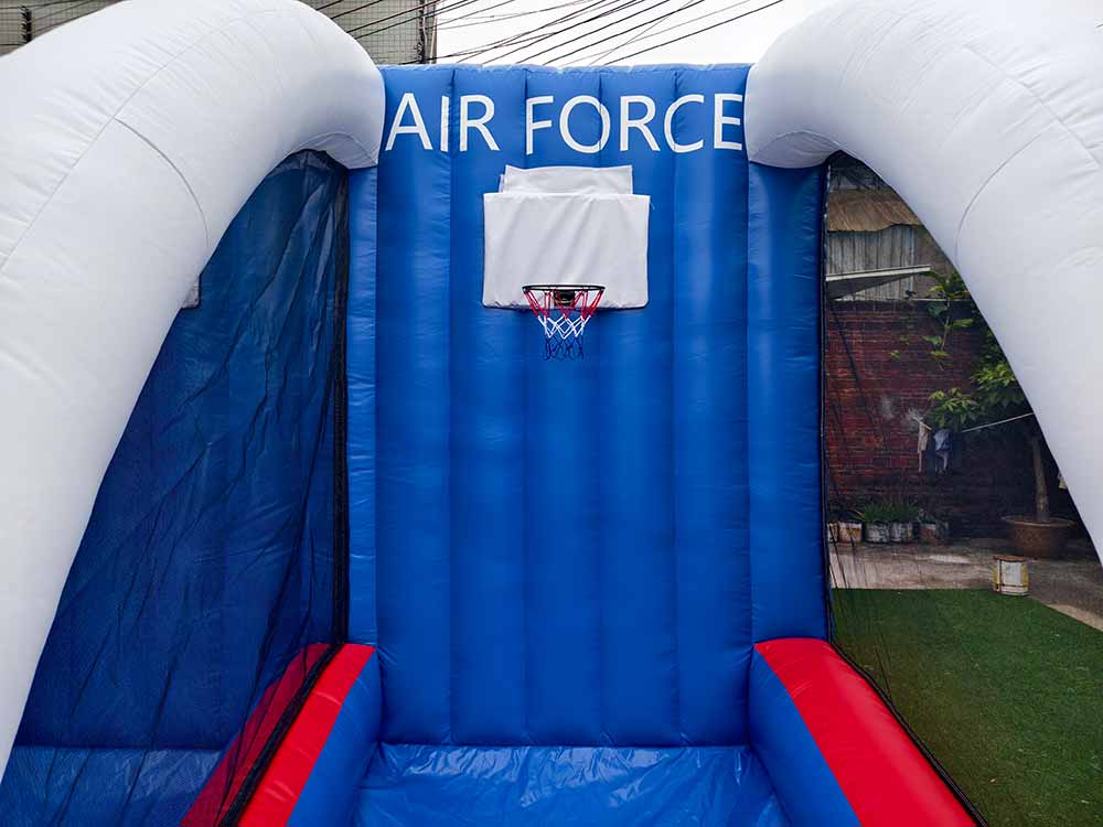 If you are looking for a popular inflatable to add to your rental inventory this 2 player inflatable basketball game is a big hit. Also popular at camps, schools, and with company team building events. We can fully customize it with your color choices and even UV print your logo on it for no additional charge. Comes with real basketball hoops with netting and an acrylic backboard. This allows you to use real basketballs.