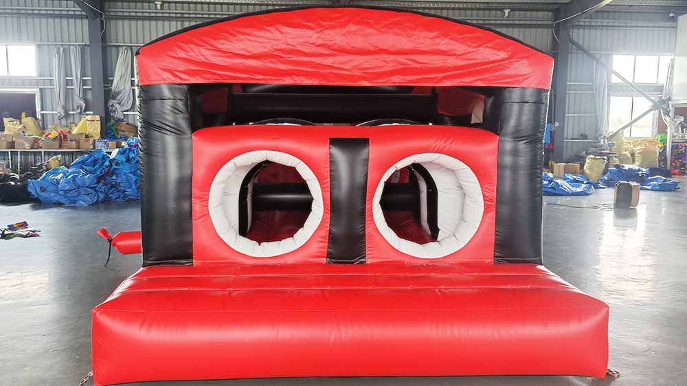 Affordable 33ft dual challenge inflatable obstacle course. It includes 2 lanes so 2 runners can race through it at the same time. You can choose up to 3 custom color combos for no additional charge. We will also UV print your logo on it for free. The pictures on this page showcase custom colors we have made for other clients.