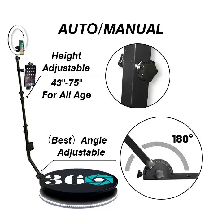 Our 360 photo booth machine allow you to capture 360-degree photos or panoramic images. The resulting images can be viewed in an immersive, interactive format, allowing the viewer to look in any direction within the scene. You can attach your phone, tablet or even camera to it for taking pictures or videos. It comes with a Bluetooth enabled controller that you can connect to your devices for controlling the photo taking.