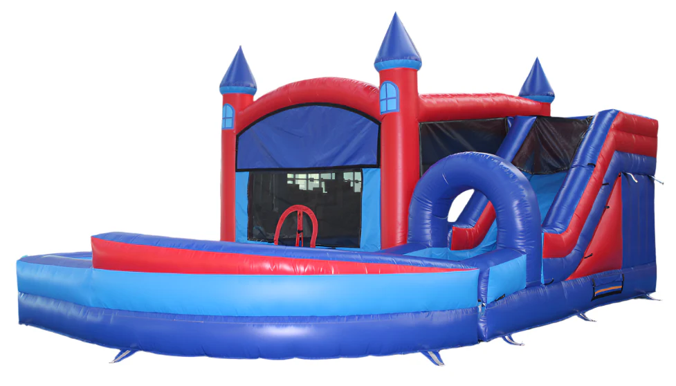 The large jump area has non-slip material with a grip climbing ladder leading up to an the water slide. head down the curved slide. We can also create a banner with your logo on this castle combo bounce house.