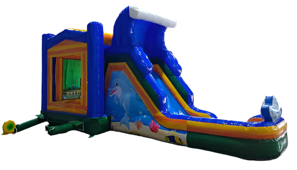 Our 25ft inflatable dolphin bounce house with slide is vibrant colors with large dolphins on the side of it. This commercial grade dolphin combo bouncer is made out of heavy duty PVC Tarpaulin. Use the slide wet or dry.