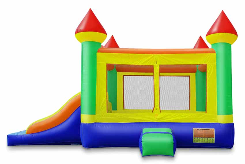 The Double Slide Bounce House is crafted using durable, 100% PVC vinyl for everything from its structural columns and crossbeams to the surfaces of its slides. This material offers puncture resistance PVC ensuring it remains intact, colorfast, resistant to mold, and straightforward to maintain. Quick deflation and storage are facilitated by zippered flaps. It also comes equipped with an advanced 1200 watt, 1.5 horsepower blower that's UL-Listed, featuring a safely grounded power cord and a protective cover for its on/off switch (It's advised to use GFCI-protected outlets and to keep the blower and its cords dry).