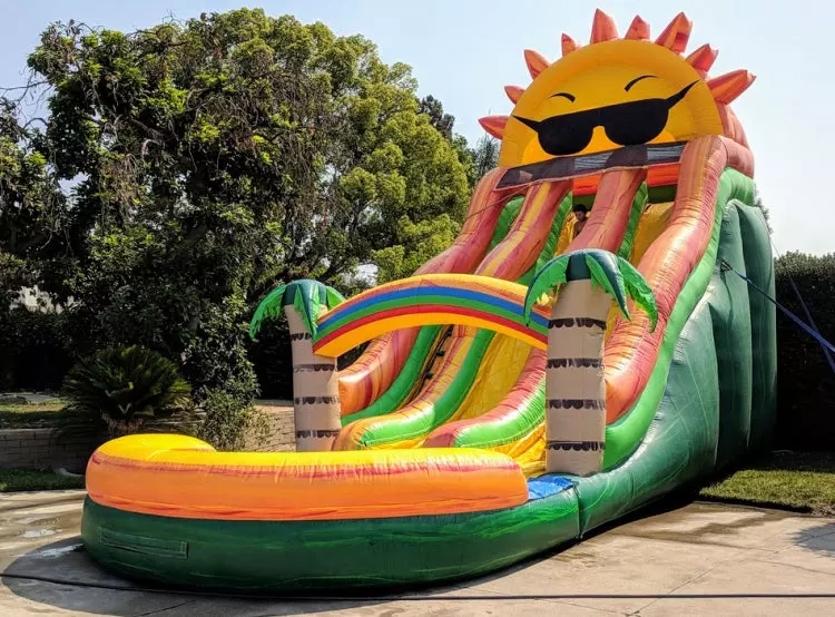 Our commercial grade sun inflatable water slide really makes an impact with its vibrant colors, big sun right on the top, palm trees and even a rainbow. Includes 2 lanes so 2 sliders can race down at the same time. Logo can be added for no additional charge.