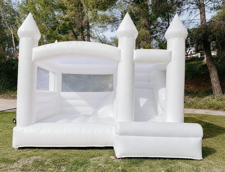 Our white castle bounce house is popular at weddings or other events. It is the perfect bounce house for adults. We offer a white castle bounce house with slide, with a slide and ball pit or a smaller one without the slide. This commercial grade white wedding bounce house is made out of heavy duty PVC Tarpaulin. It includes an air blower, a storage bag and a repair patches.